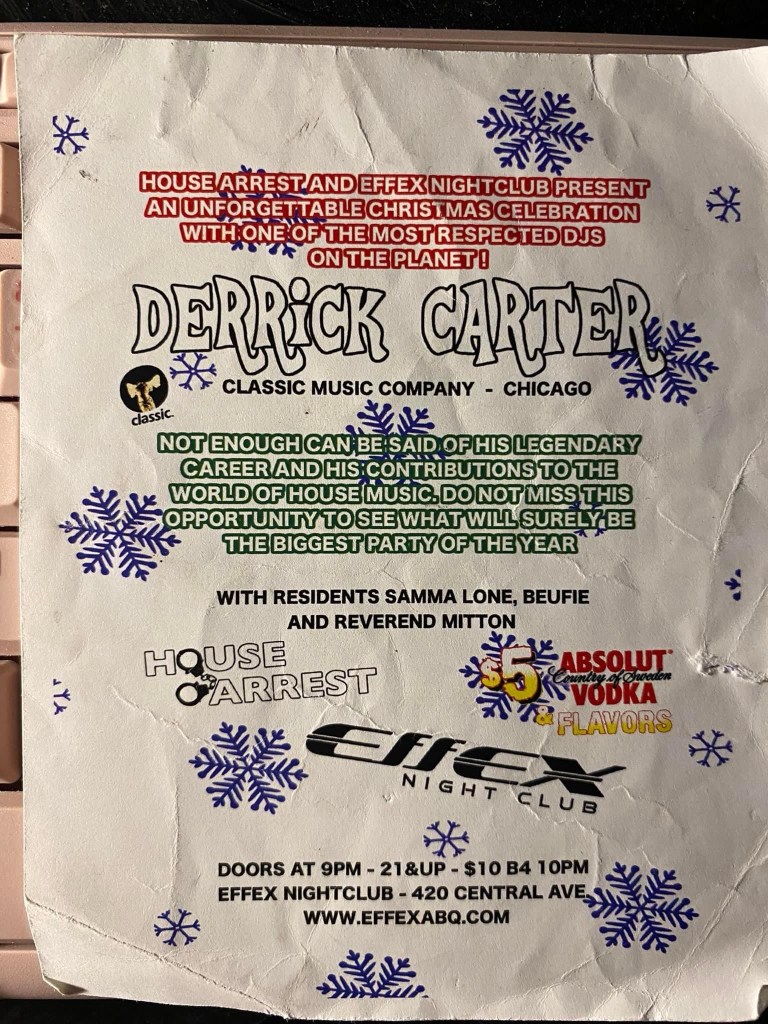 I saw Derrick again late in my twenties when I moved back to the 505 after finishing college. He was playing at this club downtown called Effex, and if I’m remembering it right, this would be my first time going to this specific club.