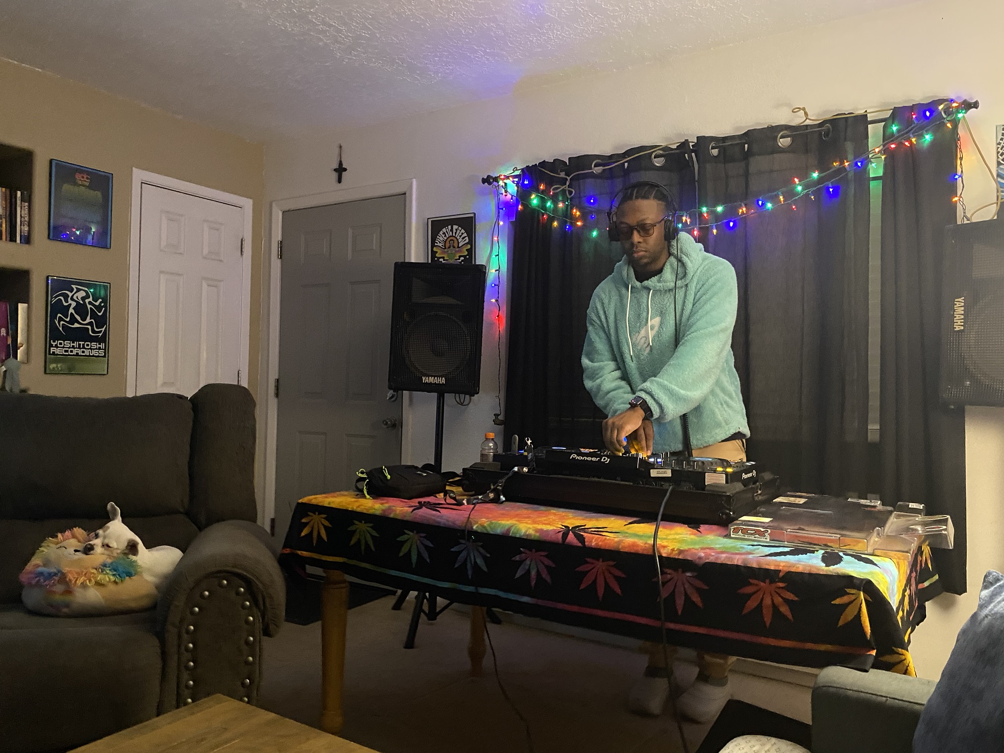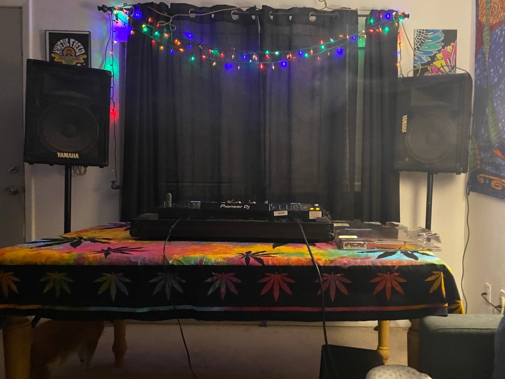 He arrived just after 5 pm as I was testing out the setup I had made in my living room just for the night. I decided to use my kitchen table to hold the weight of my XDJ, and a Yamaha speaker was set up on each side to enforce that extra bounce necessary when inviting a DJ over to play for you.