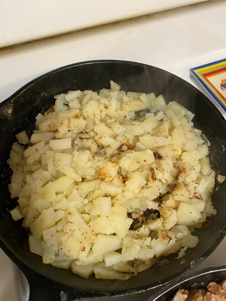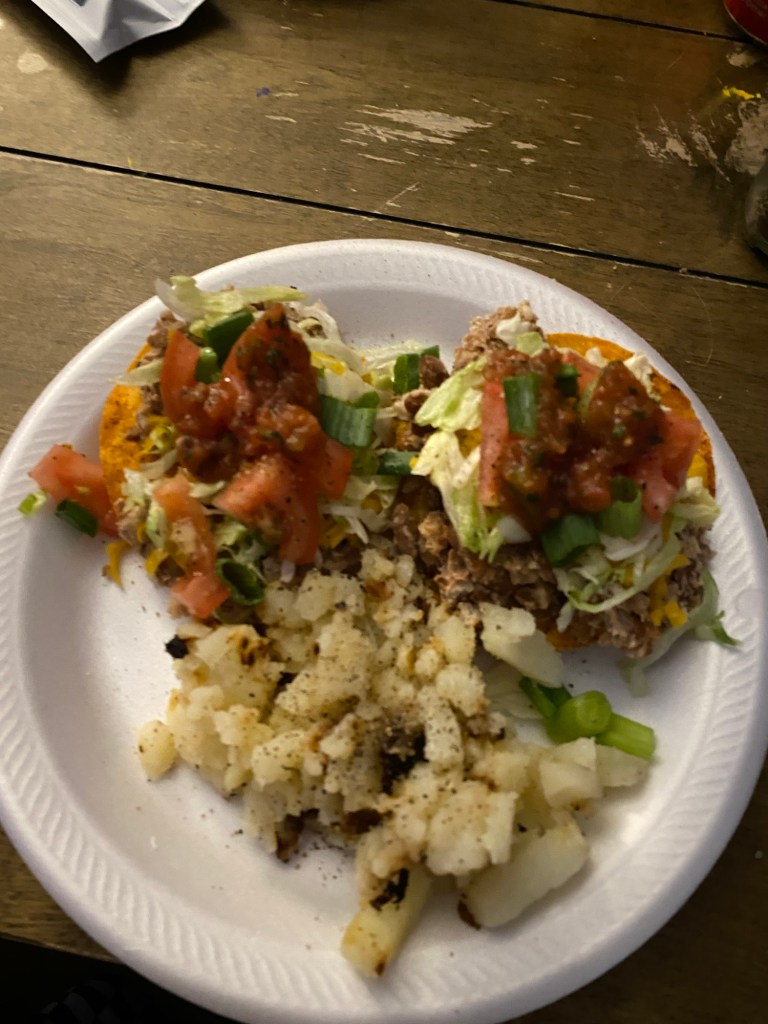 Beans made in the crock pot, tostadas, fried potatoes on the side, and we even got some tortillas from the Frontier, just to give it that nice homemade taste.